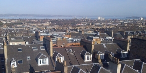 From the back of our building on George Street we see this view across Edinburgh. It extends to the Firth of Forth and beyond to the hills of Fife and Stirling. The Forth is on the flight path into Edinburgh airport, a notably fine approach.