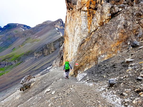 The four highest cols in particular, the Surenenpass (2,291m), Sefinafurgga (2,612m), Hohturli (2,778m) and the Bunderchrinde (2,385m), involve loose tracks over scree and shale. In descent from the Hohturli to the Oechinensee there is hard walking on rocky paths, with drops to one side (lateral moraines). Chains aid the scree ascent up to the Sefinafurgga; wooden ladders down from the Sefinafurgga and up to the Hohturli give solid walking. The Via Alpina has no via ferrata or climbing sections and is considered a walk throughout, albeit at times a very challenging one.