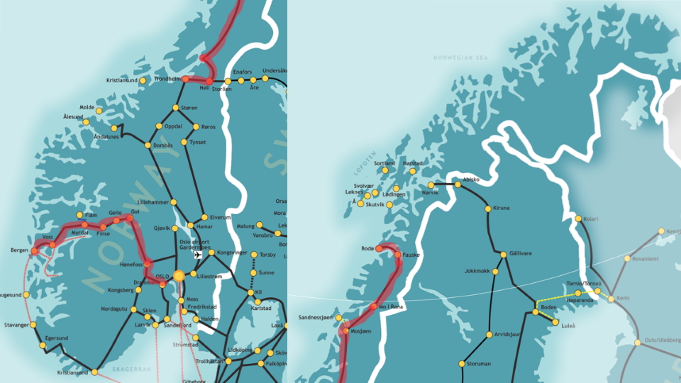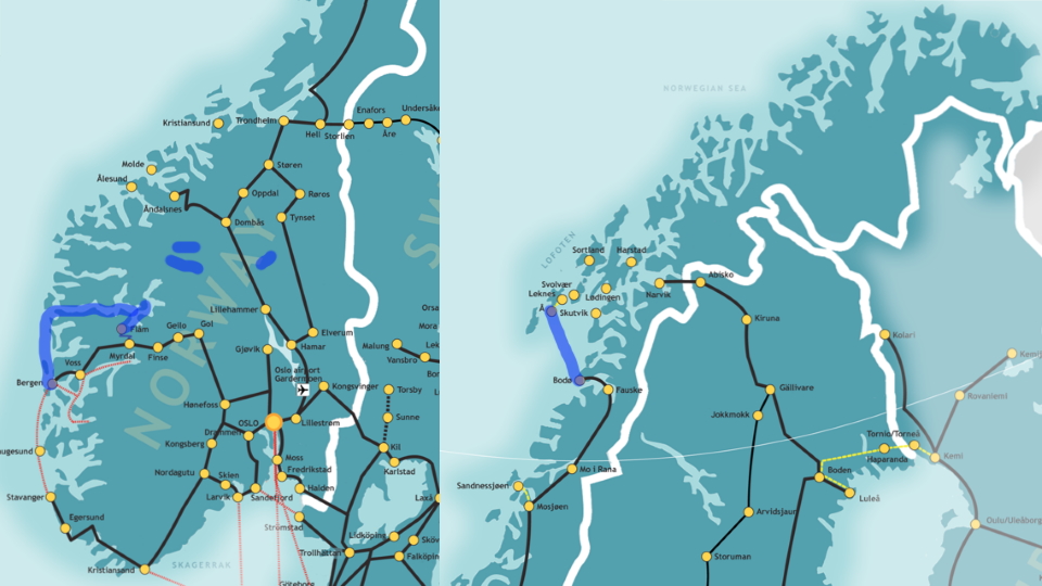 Norway as an enormously long but mountainous country has few rail lines, really 5 plus a branch line, but each is fabulous. We’ve just described 2 of them, and here are the other 4: