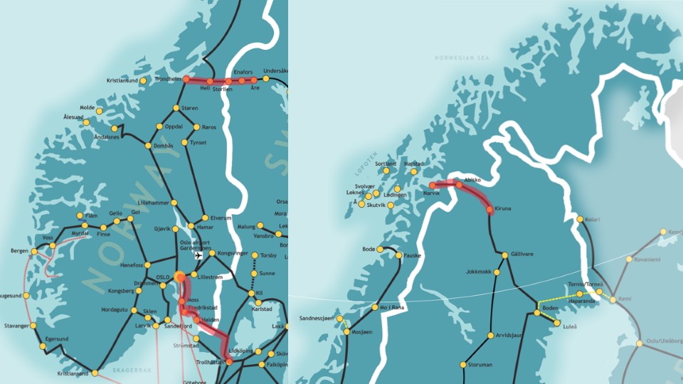 Trains set off South from Oslo along Oslofjord towards Gothenburg. Alternatively on a separate line they head East inland towards Stockholm.