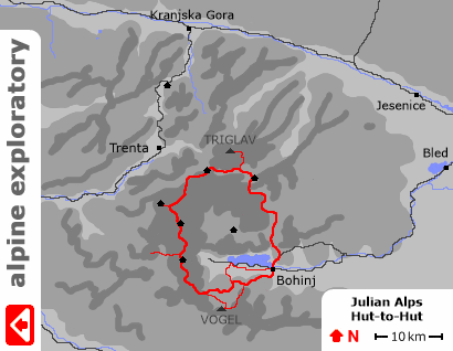 The Julian Alps are distinguished by a dense network of paths on good ground, plus an equally dense network of mountain huts. We approach the range from the point of view of the trekker, making tours of the mountains and moving from hut to hut. This is slightly different from an equally valid approach, to walk up to a hut, climb a peak in the morning and walk down.