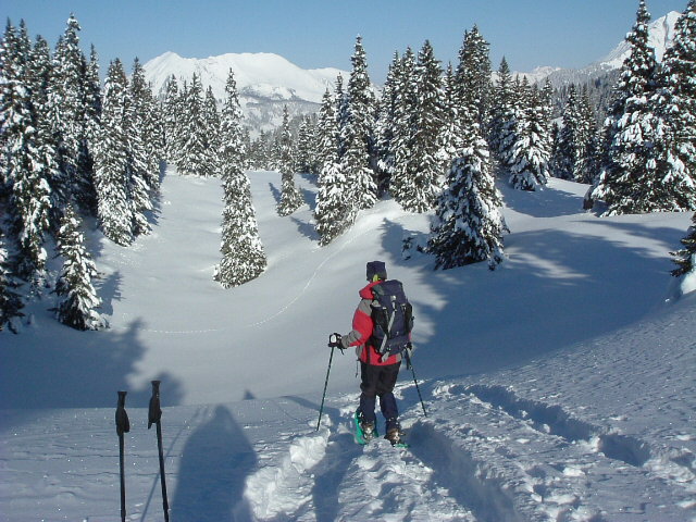 A typical day’s snowshoeing might start off in a forest. If you’re in luck the snow will be falling and there will be pure silence as the animals and birds save their energy instead of looking for food that’s hidden by the snow. Perhaps your route will take you up onto the hillside on tracks or paths, through summer meadows now under a carpet of clean white snow. A more challenging snowshoe walk might head for a small hill, climbing through trees to emerge onto rounded upper slopes with views of peaks and ridges all around.